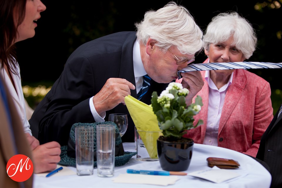 Het was voor Jacqueline een bruiloft naar haar hart. Iedereen genoot van de dag en van elkaar. Geen stress en heel ongedwongen. 'Zo'n moment dat een stropdas als zakdoek of servet wordt gebruikt, is natuurlijk sowieso een cadeautje voor een fotograaf, maar het gezicht van tante Corrie maakt de foto voor mij af', aldus Jacqueline.